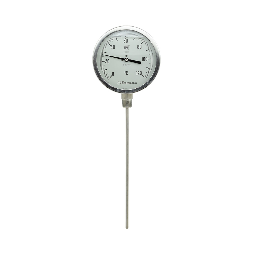 این ترمومتر از نوع بیمتال تلسکوپی است. تغییر دما باعث انبساط و انقباض نوار بیمتال داخلی میشود. این تغییر مکان به حرکت عقربه منتقل میگردد و مقدار دما روی صفحه نمایش داده میشود. مکانیزم بیمتال عملکردی پایدار، ساده و بدون نیاز به منبع تغذیه ارائه میدهد.